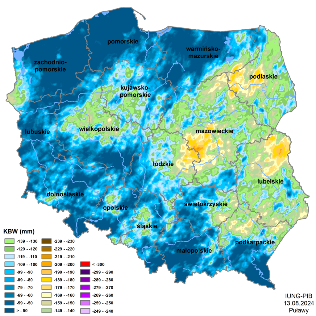 W dziewiątym okresie raportowania tj. od 11 czerwca do 10 sierpnia 2024 roku średnia wartość Klimatycznego Bilansu Wodnego (KBW) dla kraju, na podstawie którego dokonywana jest ocena stanu zagrożenia suszą, była ujemna, wynosiła -78 mm. Deficyt wody w obecnym okresie w stosunku do poprzedniego okresu sześciodekadowego uległ zwiększeniu o 12 mm.