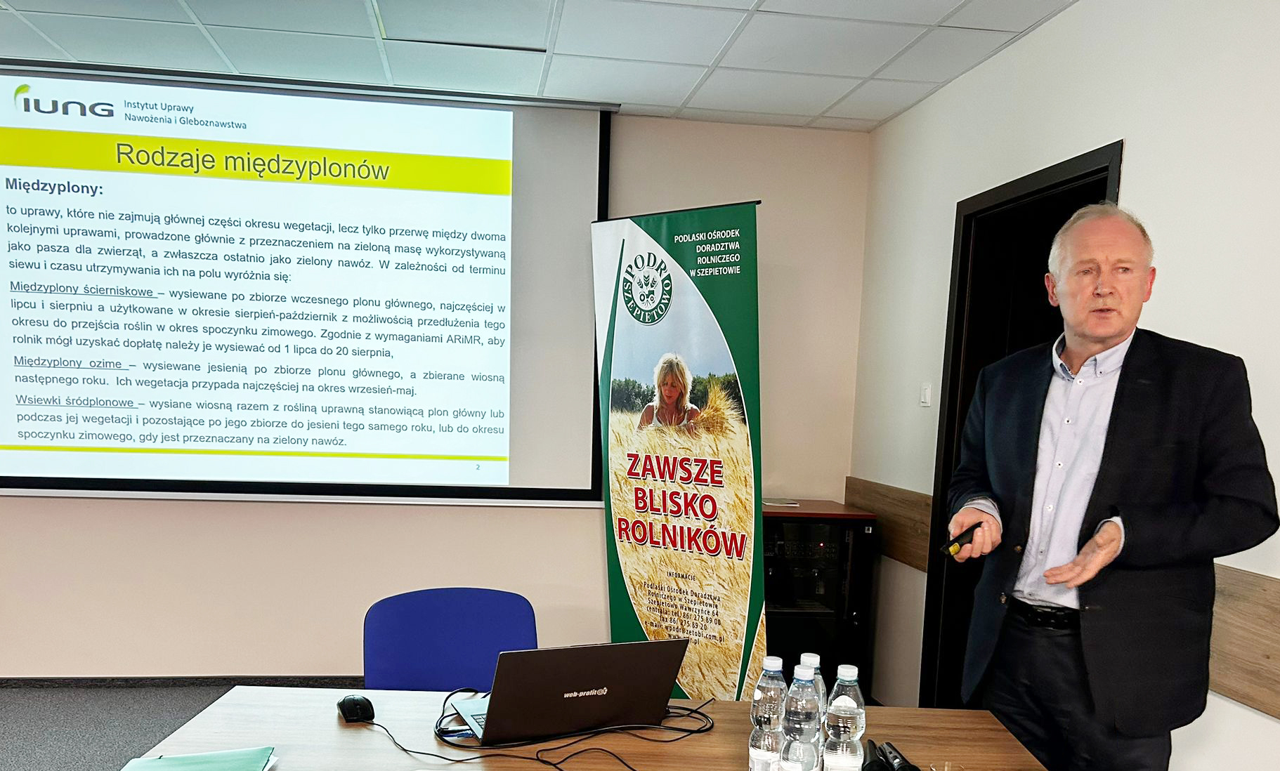 W dniu 16 września 2025 r. w Podlaskim Ośrodku Doradztwa Rolniczego w Szepietowie odbyły się warsztaty pt. „Doskonalenie uprawy międzyplonów jako praktyki rolnictwa węglowego”. Warsztaty były współorganizowane przez Instytut Uprawy Nawożenia i Gleboznawstwa – Państwowy Instytut Badawczy w Puławach i Podlaski Ośrodek Doradztwa Rolniczego w Szepietowie. Spotkanie zorganizowano w ramach realizacji zadania 2.5 w Dotacji Celowej Ministerstwa Rolnictwa i Rozwoju Wsi.