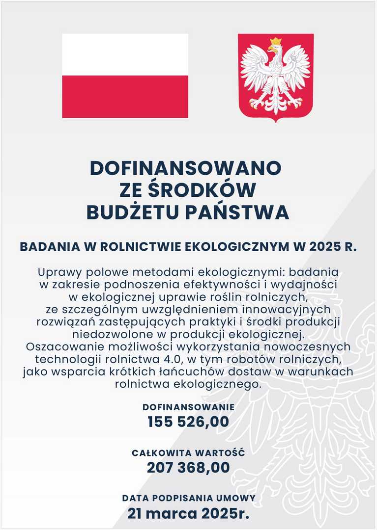 W roku 2025 realizowano w IUNG-PIB nowe zadanie badawcze dotyczące wykorzystania robotów rolniczych w rolnictwie ekologicznym. W ramach zadania pt.: „Uprawy polowe metodami ekologicznymi: badania w zakresie podnoszenia efektywności i wydajności w ekologicznej uprawie roślin rolniczych, ze szczególnym uwzględnieniem innowacyjnych rozwiązań zastępujących praktyki i środki produkcji niedozwolone w produkcji ekologicznej. Oszacowanie możliwości wykorzystania nowoczesnych technologii rolnictwa 4.0, w tym robotów rolniczych, jako wsparcia krótkich łańcuchów dostaw w warunkach rolnictwa ekologicznego” założono eksperyment polowy w RZD „Kępa” Puławy.